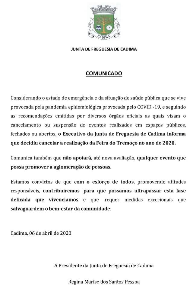 A Junta de Freguesia de Cadima emitiu esta tarde um comunicado onde dá a saber a todos os interessados que por motivo do Estado de Emergência instalado em Portugal , a Feira do Tremoço foi cancelada