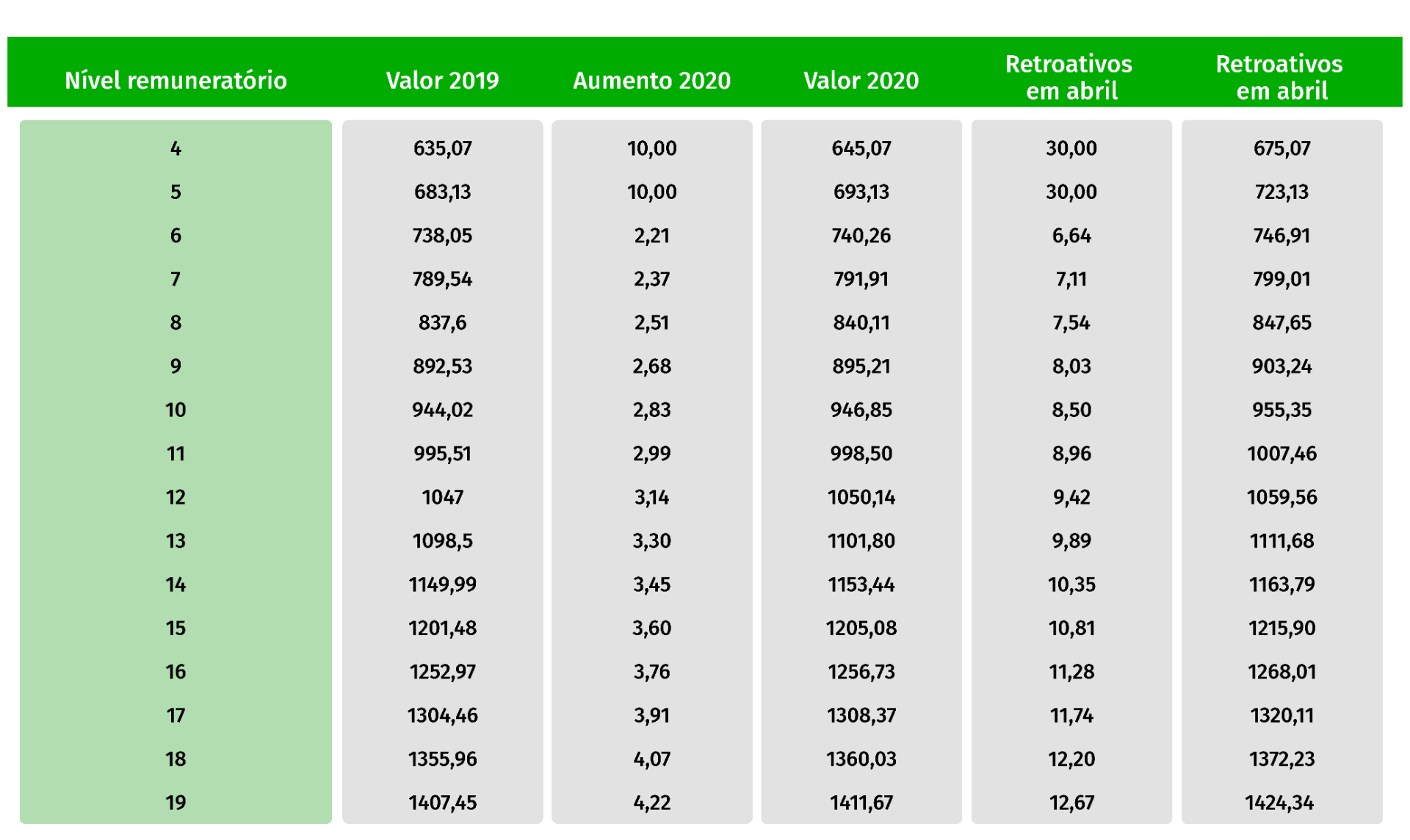 No caso dos trabalhadores acima desses dois escalões da TRU, o aumento é previsto é de 0,3%, variando, em termos absolutos, entre dois euros e 19 euros mensais brutos. Com os retroativos, o aumento pago este mês deverá variar entre cerca de nove euros e cerca de 76 euros.